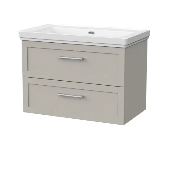 nuie Lux Larck 800mm 2- Drawer Wall Hung Unit with Traditional Fireclay Basin - 0 Tap Holes - Pebble Grey