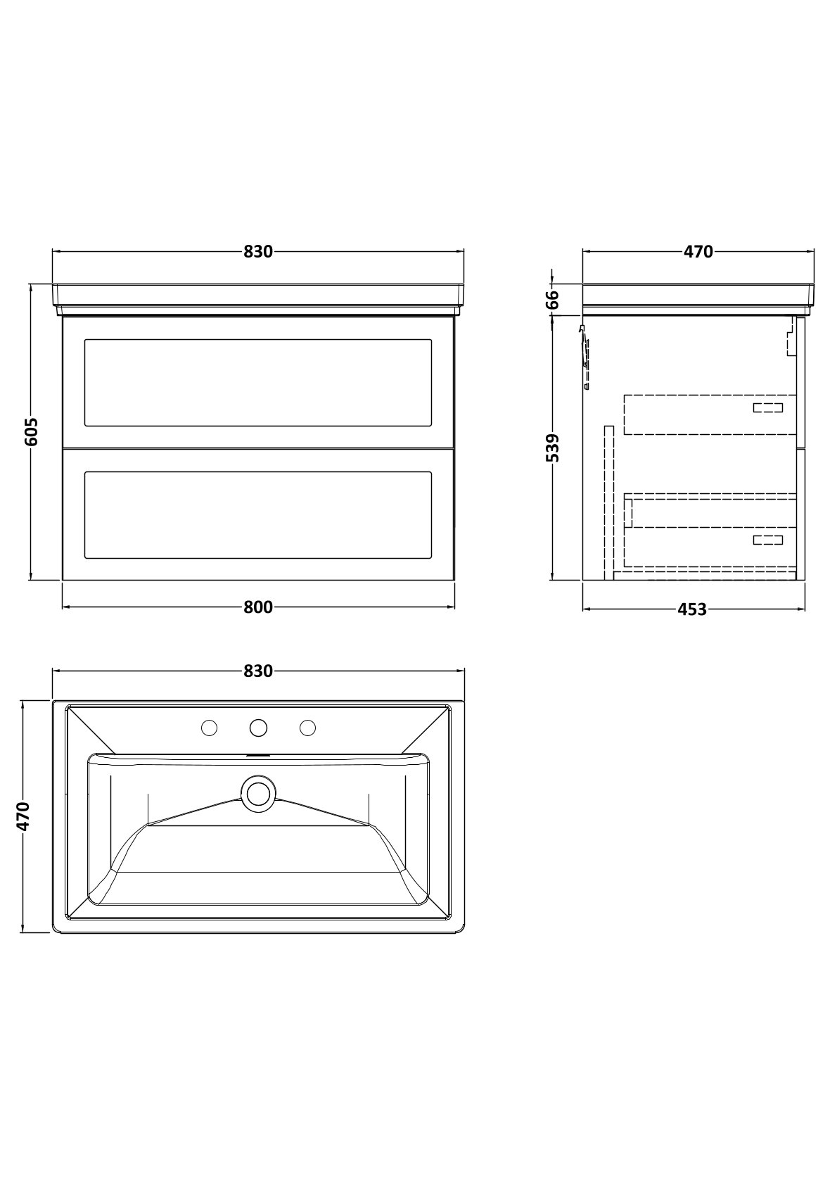 Larck 800mm 2- Drawer Wall Hung Unit with Traditional Fireclay Basin - 3 Tap Holes