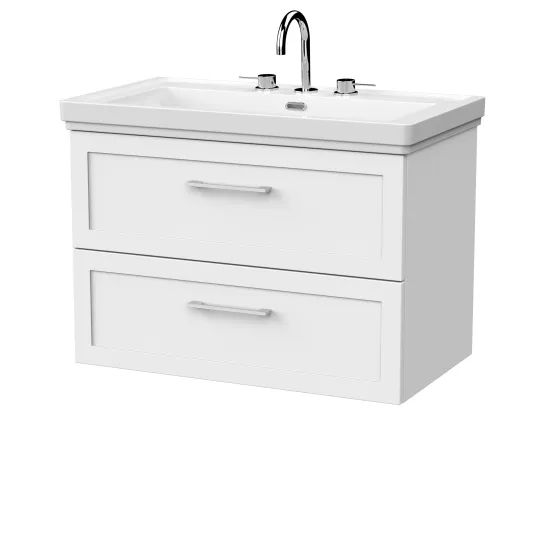 nuie Lux Larck 800mm 2- Drawer Wall Hung Unit with Traditional Fireclay Basin - 3 Tap Holes - Matt White