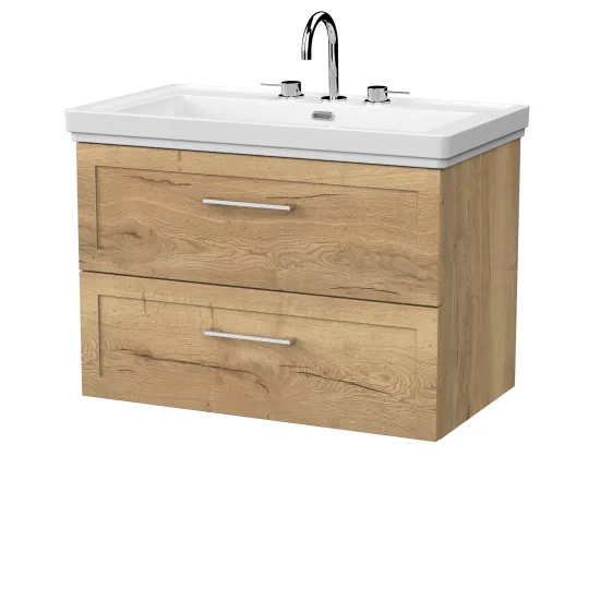 nuie Lux Larck 800mm 2- Drawer Wall Hung Unit with Traditional Fireclay Basin - 3 Tap Holes - Autumn Oak