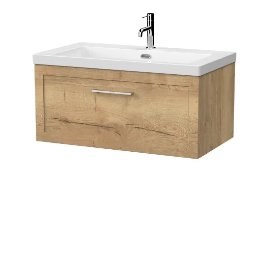 nuie Lux Larck 800mm Single Drawer Wall Hung Unit with Contemporary Fireclay Basin - 1 Tap Hole - Autumn Oak