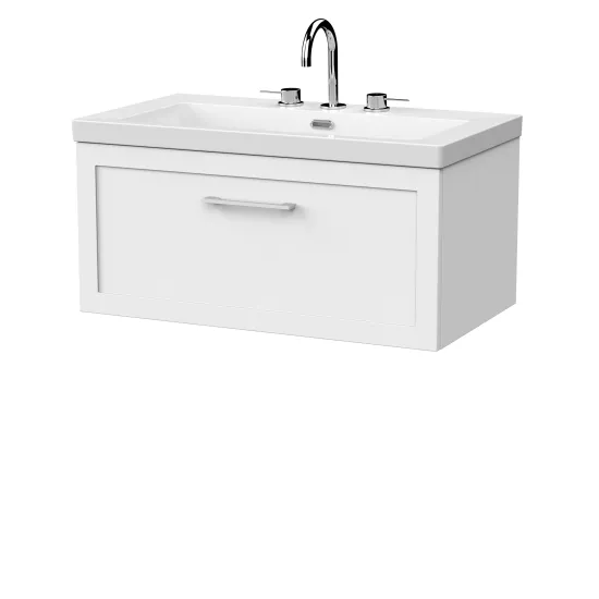 nuie Lux Larck 800mm Single Drawer Wall Hung Unit with Contemporary Fireclay Basin - 3 Tap Holes - Matt White