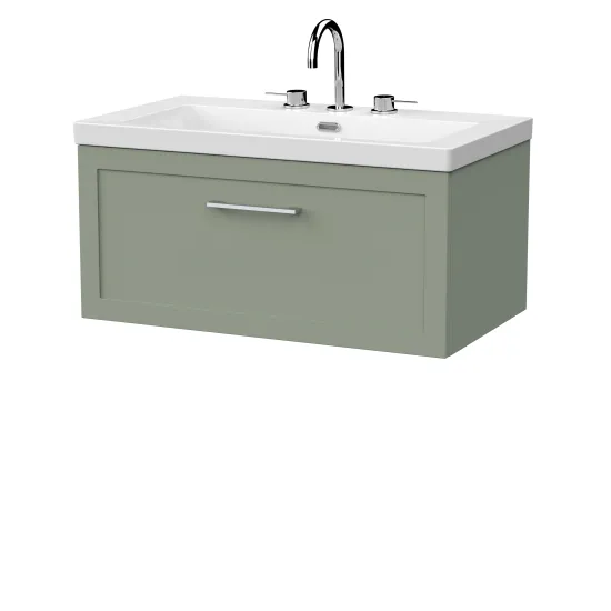nuie Lux Larck 800mm Single Drawer Wall Hung Unit with Contemporary Fireclay Basin - 3 Tap Holes - Fern Green