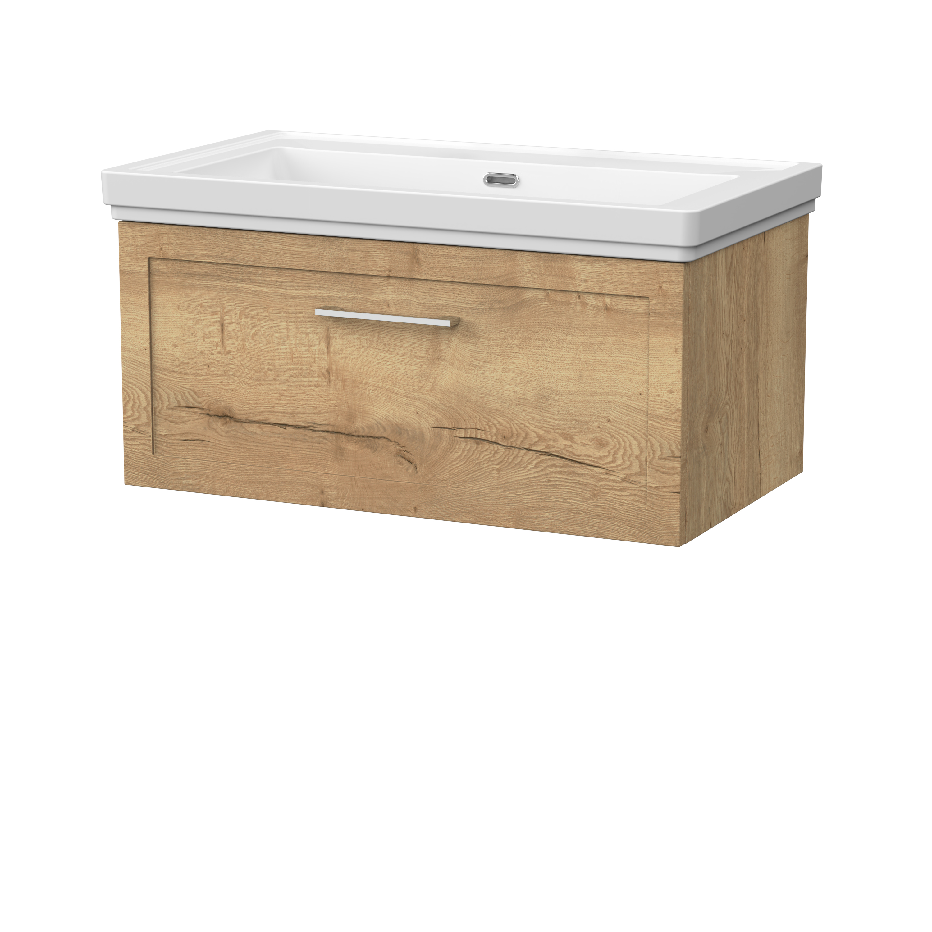 nuie Lux Larck 800mm Single Drawer Wall Hung Unit with Traditional Fireclay Basin - 0 Tap Holes - Autumn Oak