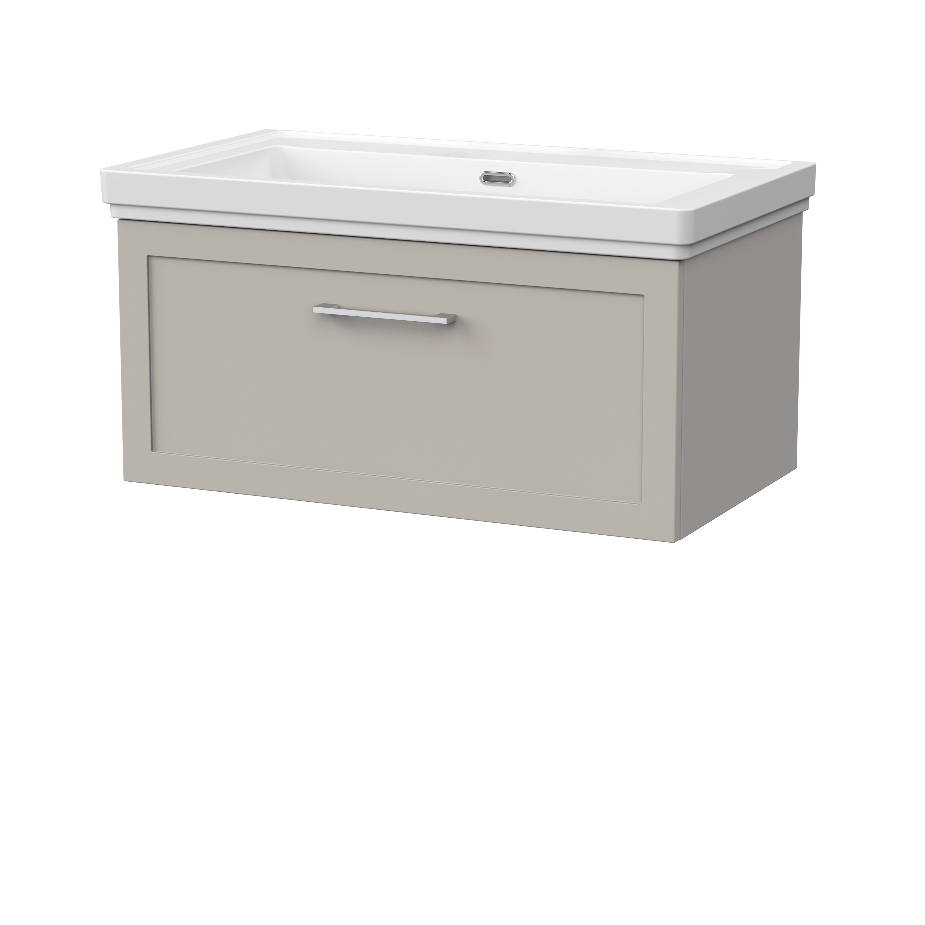 nuie Lux Larck 800mm Single Drawer Wall Hung Unit with Traditional Fireclay Basin - 0 Tap Holes - Pebble Grey