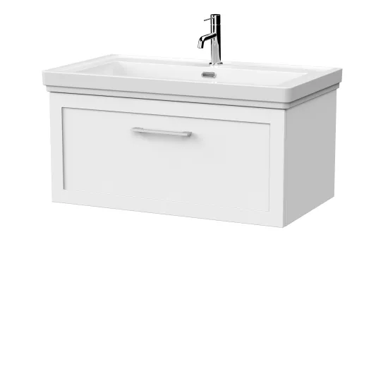 nuie Lux Larck 800mm Single Drawer Wall Hung Unit with Traditional Fireclay Basin - 1 Tap Hole - Matt White