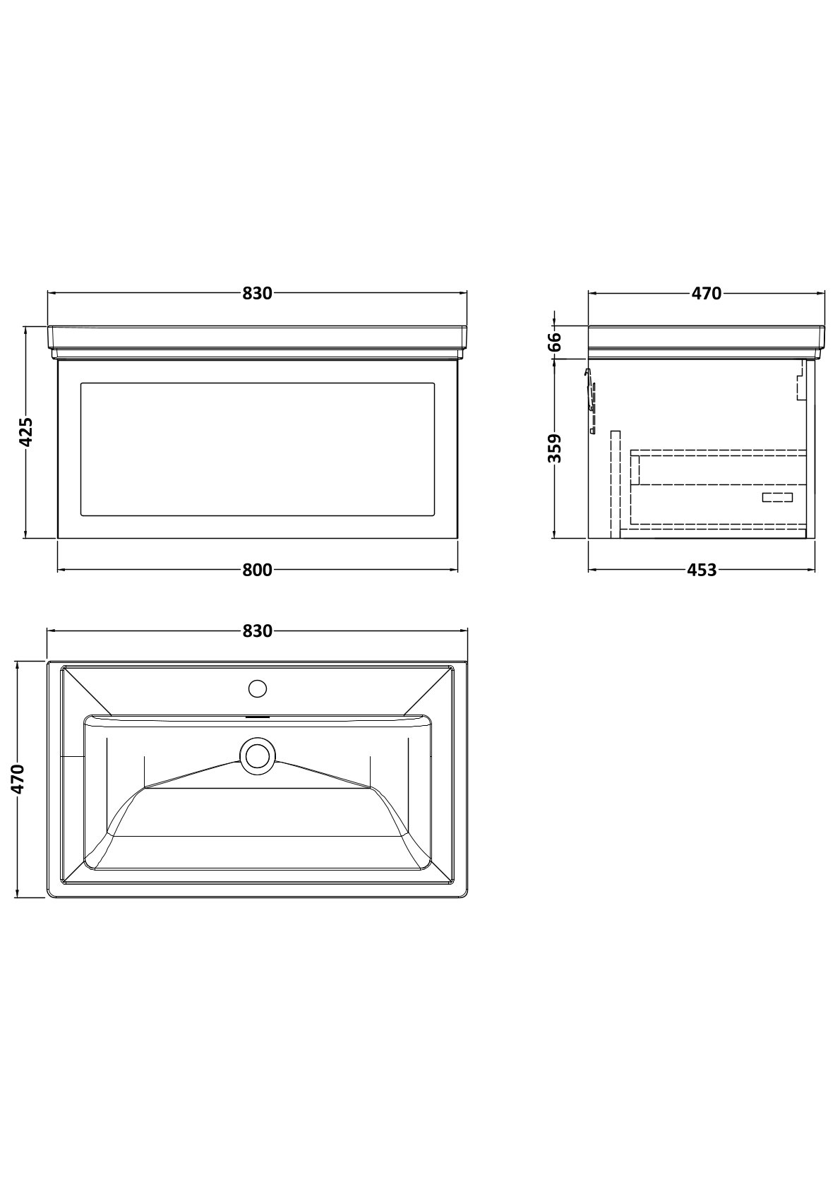 Larck 800mm Single Drawer Wall Hung Unit with Traditional Fireclay Basin - 1 Tap Hole