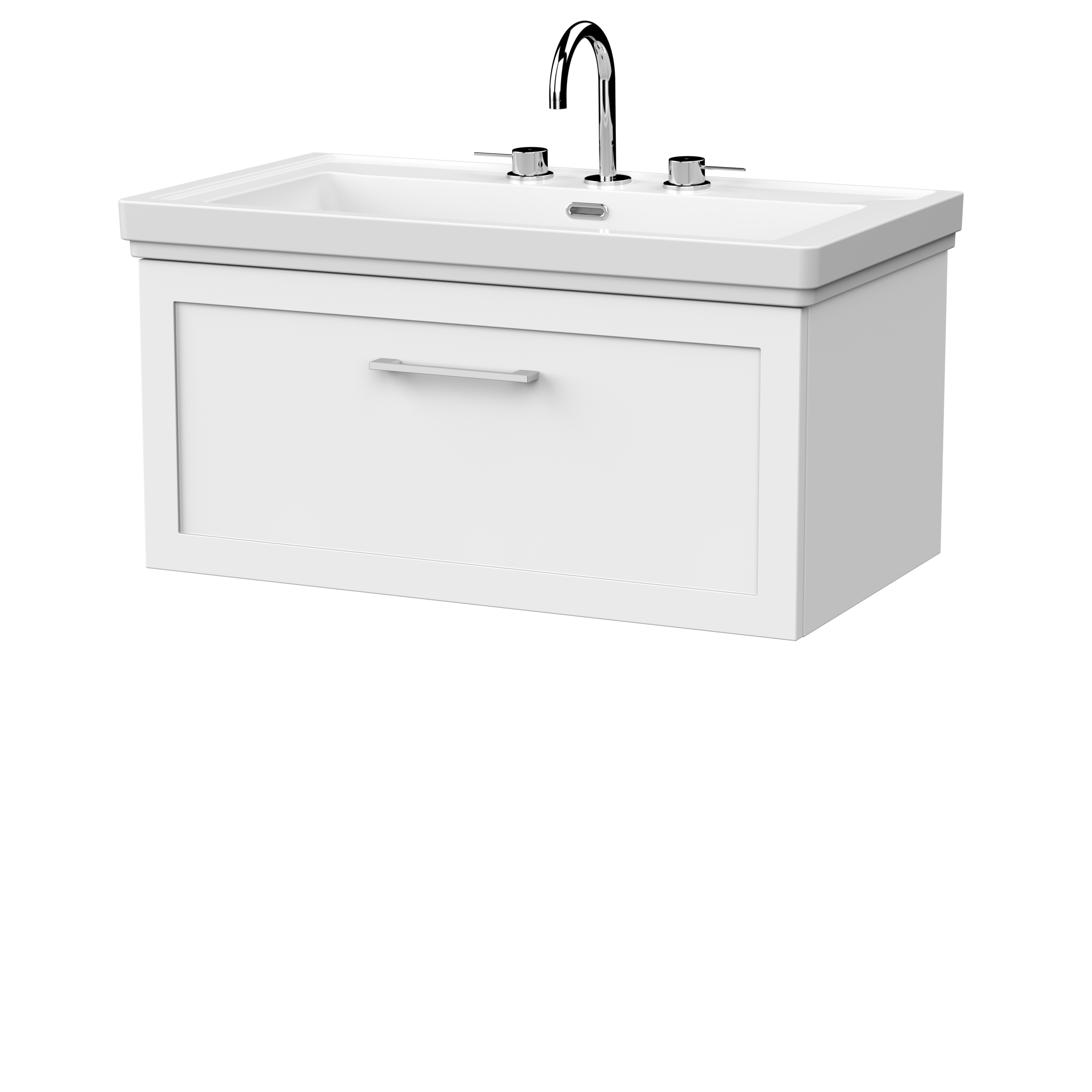 nuie Lux Larck 800mm Single Drawer Wall Hung Unit with Traditional Fireclay Basin - 3 Tap Holes - Matt White