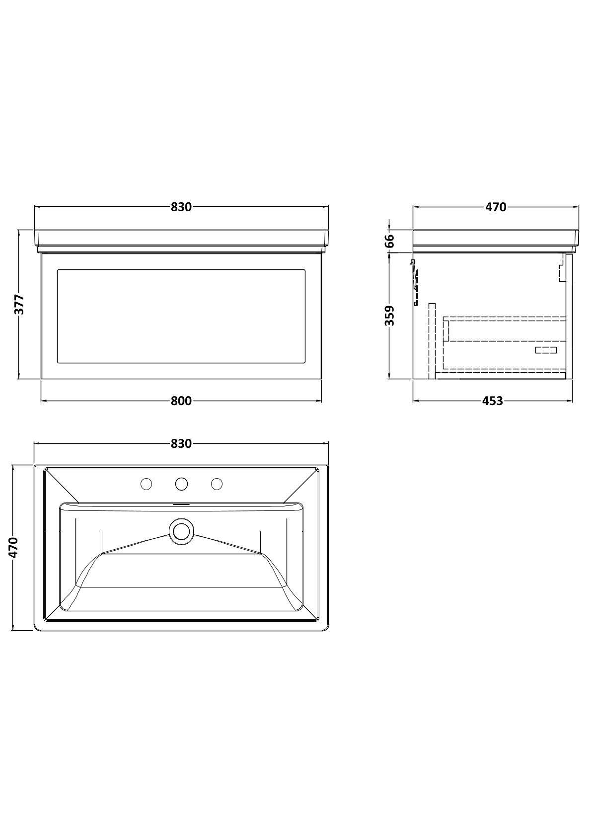 Larck 800mm Single Drawer Wall Hung Unit with Traditional Fireclay Basin - 3 Tap Holes