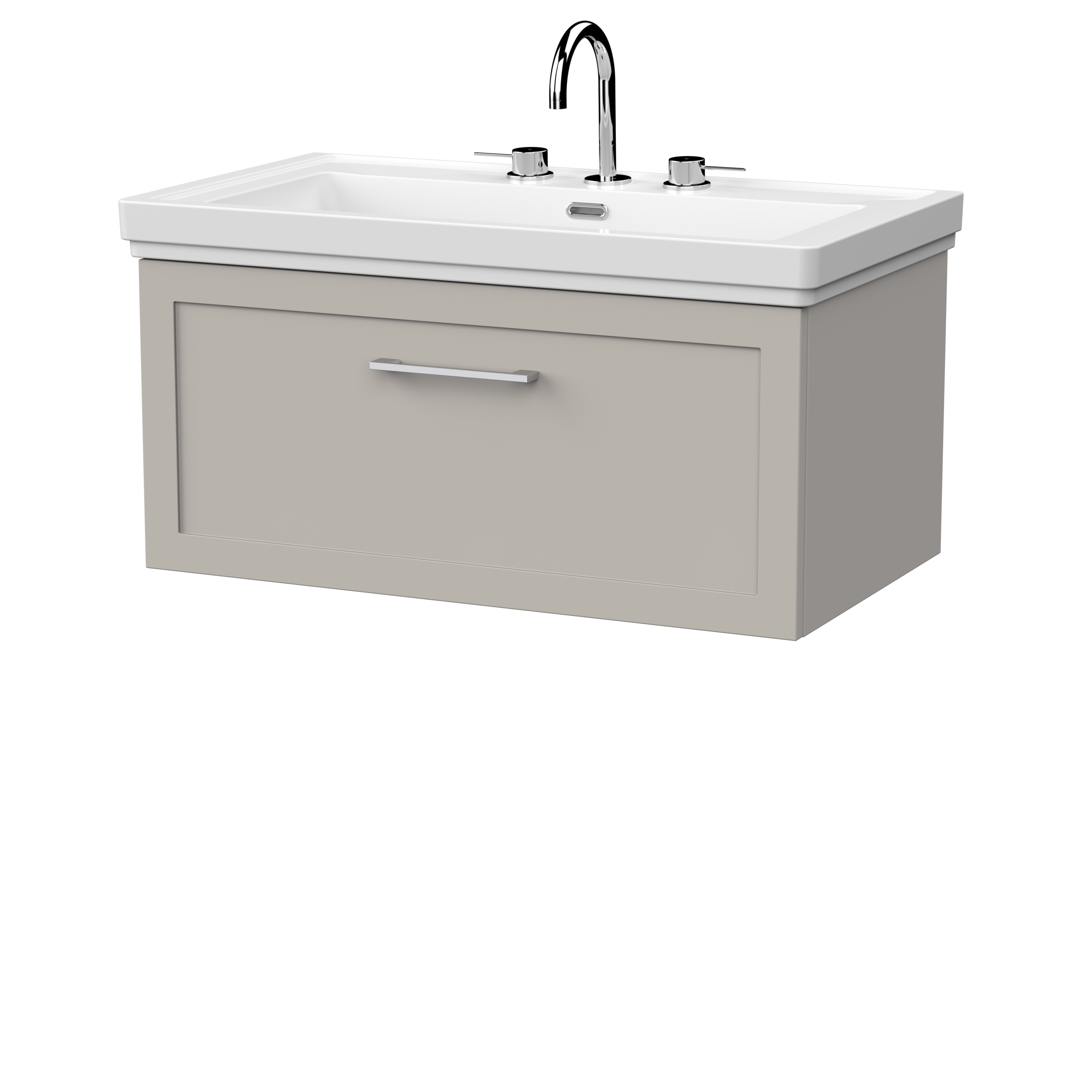 nuie Lux Larck 800mm Single Drawer Wall Hung Unit with Traditional Fireclay Basin - 3 Tap Holes - Pebble Grey