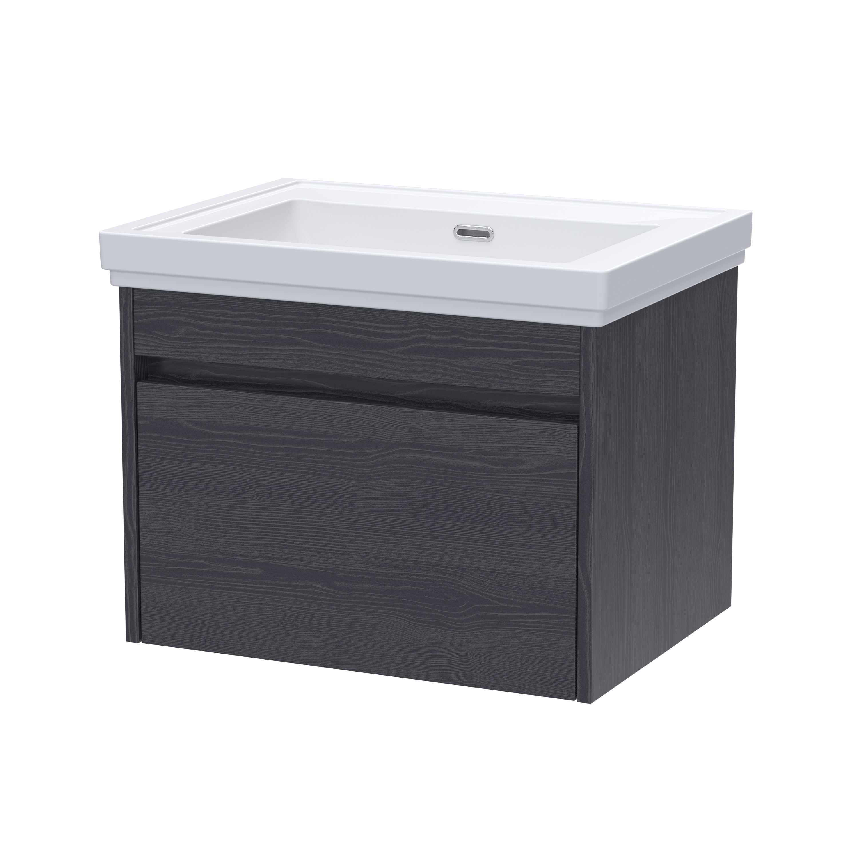 Loftwood 600mm Wall Hung 1 Drawer Unit and 0 Tap Hole Classic Basin - Graphite Grey Woodgrain