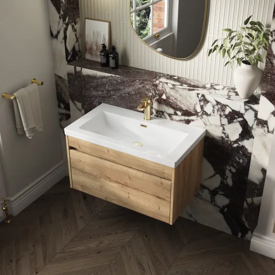 BC Designs Loftwood 600mm Wall Hung 1 Drawer Unit and 1 Tap Hole Contemporary Basin - Autumn Oak