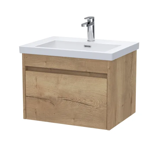 Loftwood 600mm Wall Hung 1 Drawer Unit and 1 Tap Hole Contemporary Basin - Autumn Oak