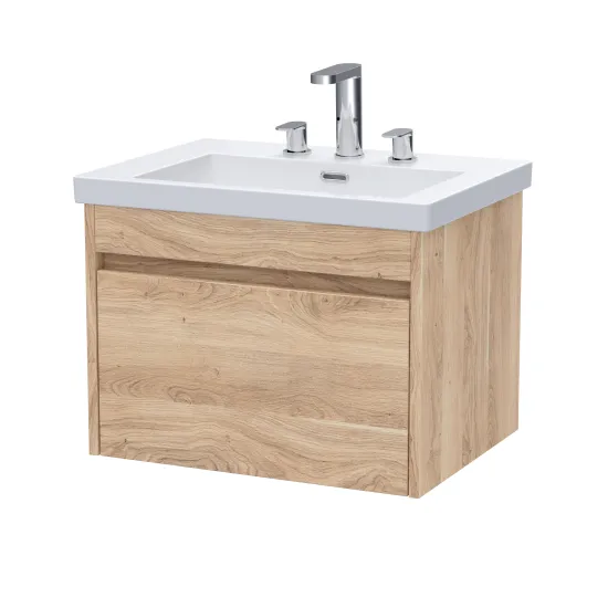 Loftwood 600mm Wall Hung 1 Drawer Unit and 3 Tap Hole Contemporary Basin - Bleached Oak