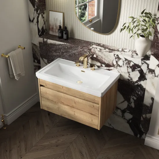 BC Designs Loftwood 800mm Wall Hung 1 Drawer Unit and 3 Tap Hole Classic Basin - Autumn Oak