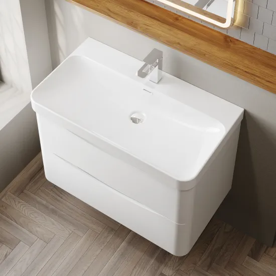 nuie Lunar Wall Hung 2 Drawer Unit & Thin Edge Ceramic Basin, 800mm - Satin White
