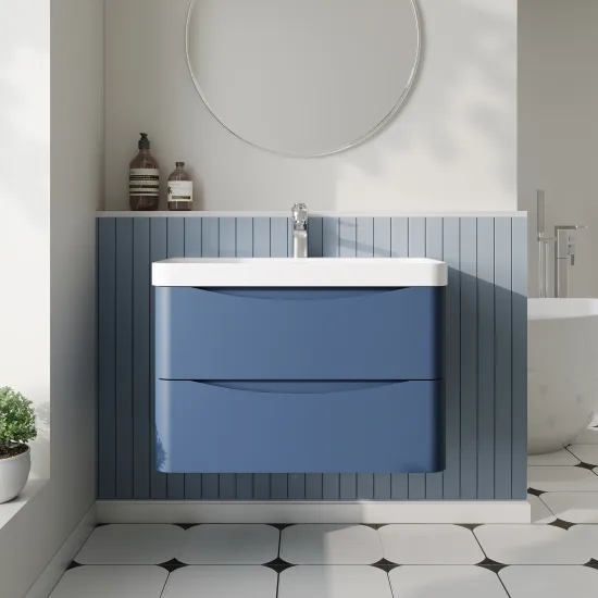 nuie Lunar Wall Hung 2 Drawer Unit & Thin Edge Ceramic Basin, 800mm - Satin Blue