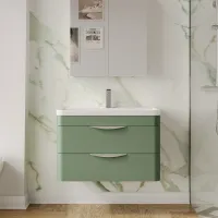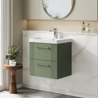 Nuie 500mm Satin Green Part Fluted Wall Hung 2-Drawer Vanity Unit with Thin-Edge Basin & Chrome Handles