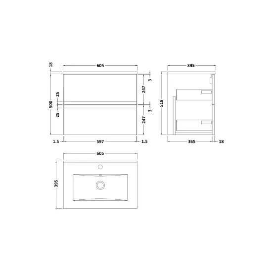 Urban 600mm Wall Hung 2-Drawer Unit and Minimalist Basin 1 Tap Hole