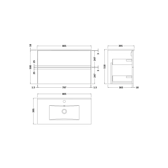 Hudson Reed Urban Wall Hung 2 Drawer Vanity Unit with Minimalist Basin 800mm - Satin White
