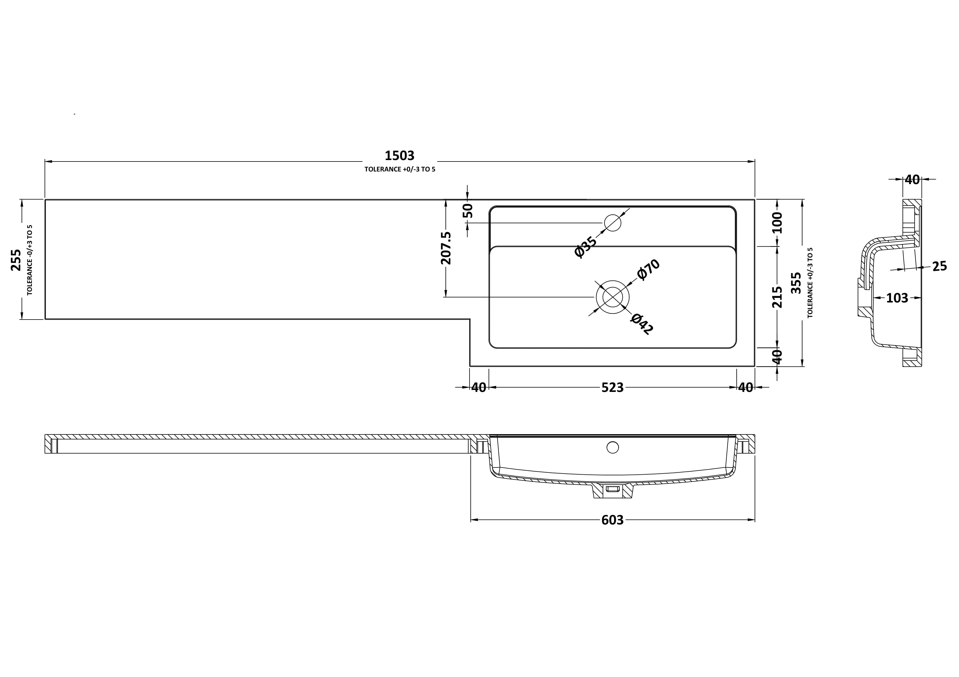 Fusion Right Hand Square L-Shaped 1 Tap Hole Polymarble Basin 1500mm