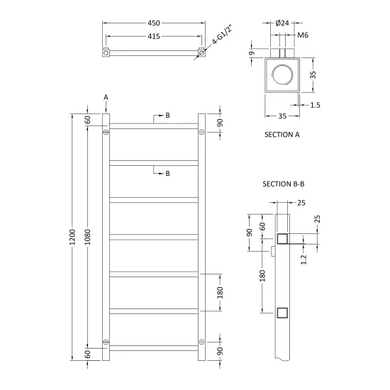 Eton Heated Towel Rail 1200 x 450mm - Chrome