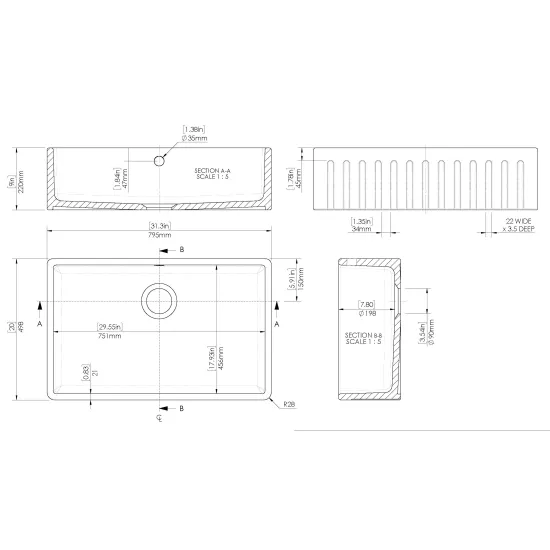 Butler Sink Fluted with Overflow 795mm x 500mm x 220mm