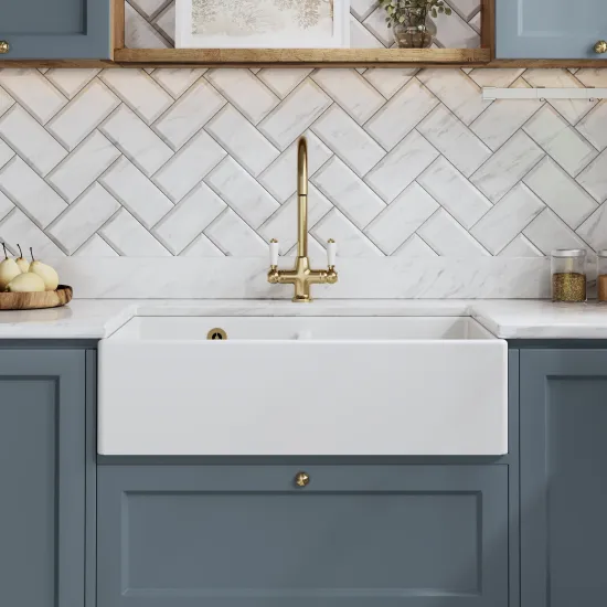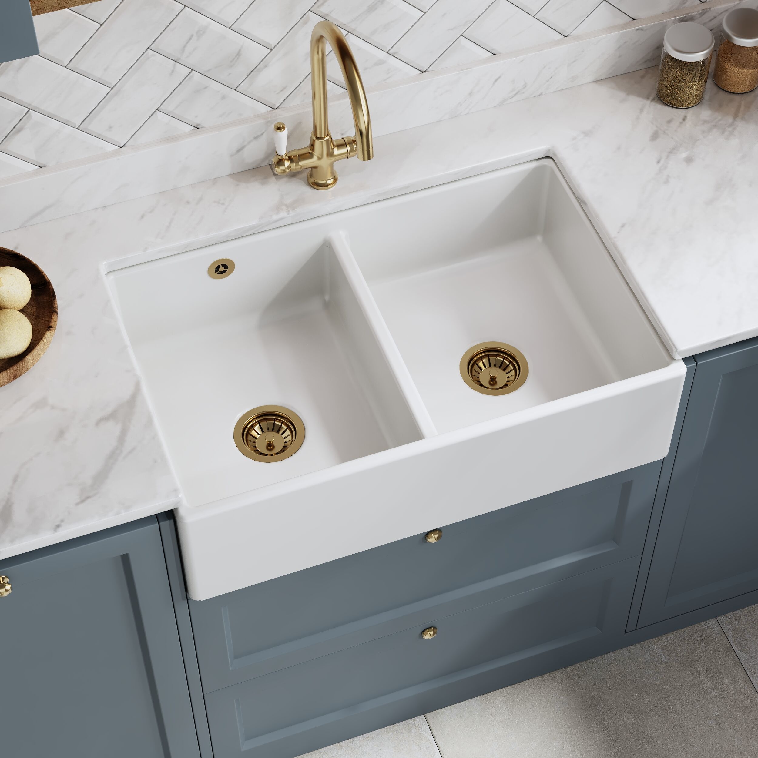 Nuie Double Bowl 795 x 500 x 220mm Fireclay White Butler Sink With Stepped Weir and Overflow