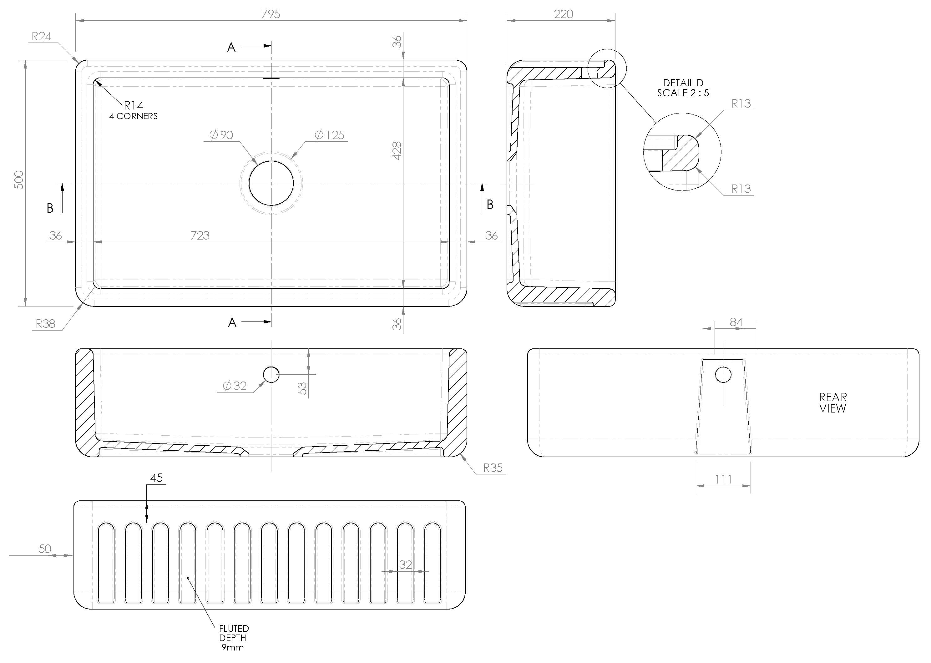 Traditional Thick Edge Fluted Butler Sink 795 x 500 x 220mm