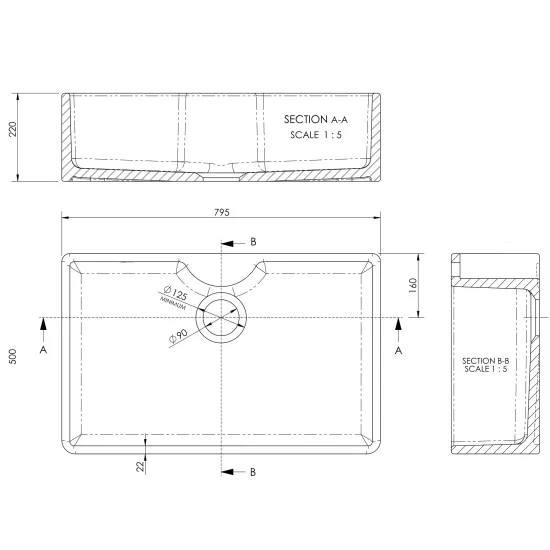 Fireclay Butler Sink Flush Weir & Overflow 795 x 500 x 220mm