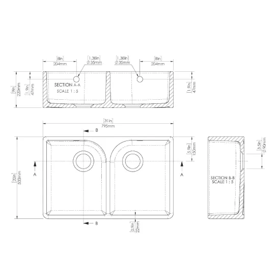 Nuie Double Bowl 795 x 500 x 220mm Fireclay White Butler Sink With Flush Weir and Overflow