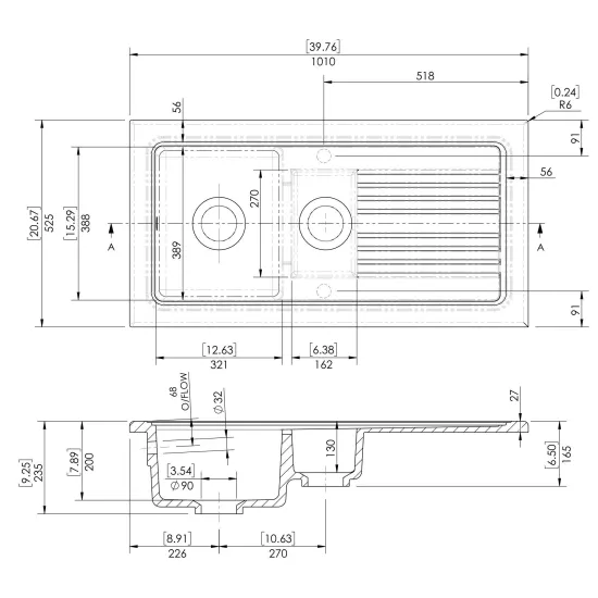 nuie Counter Top Sink 1.5 Bowl 1010 x 525mm - White