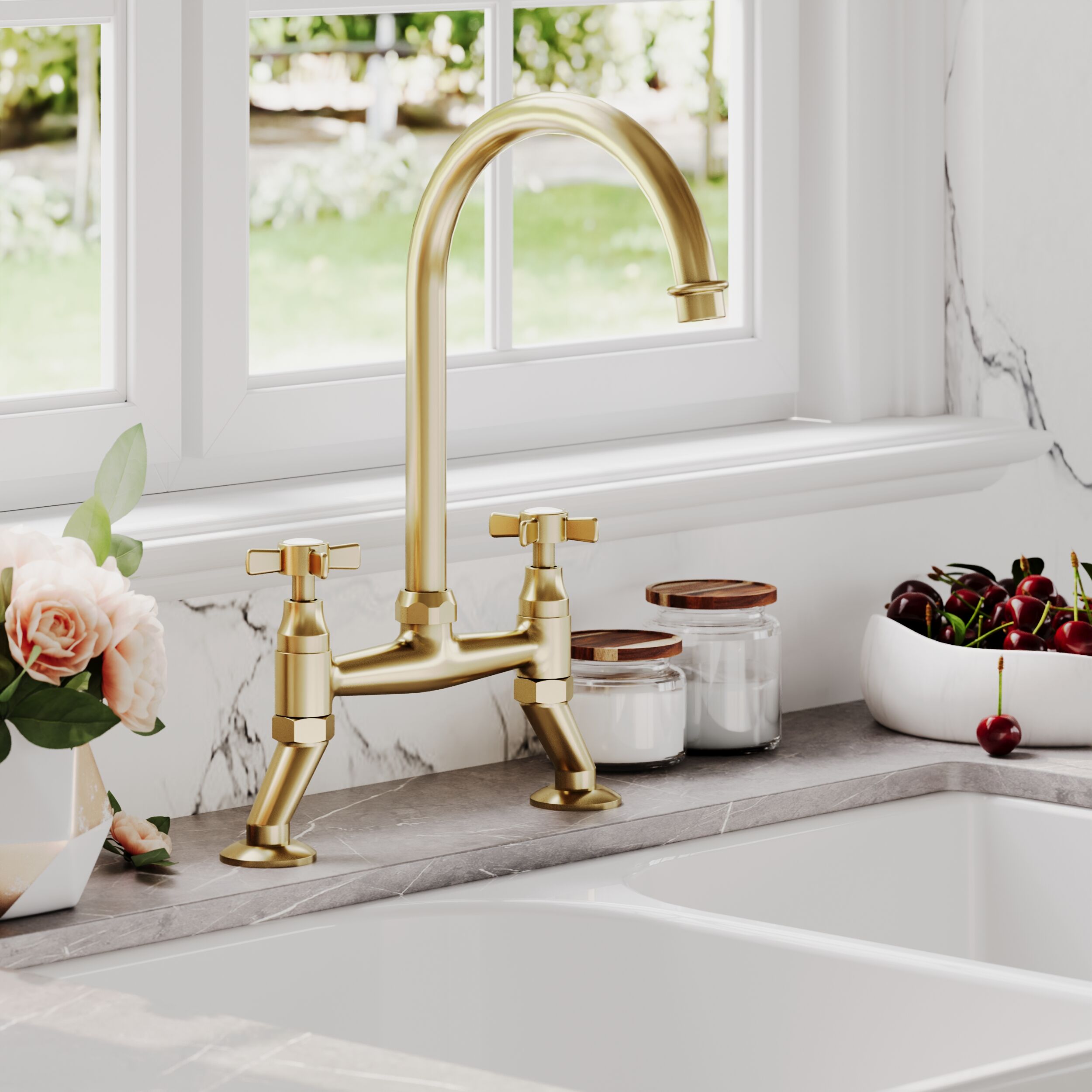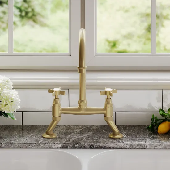 nuie Kitchen Taps Traditional 2 Tap Hole Bridge Mixer Tap with Crosshead Handles - Brushed Brass