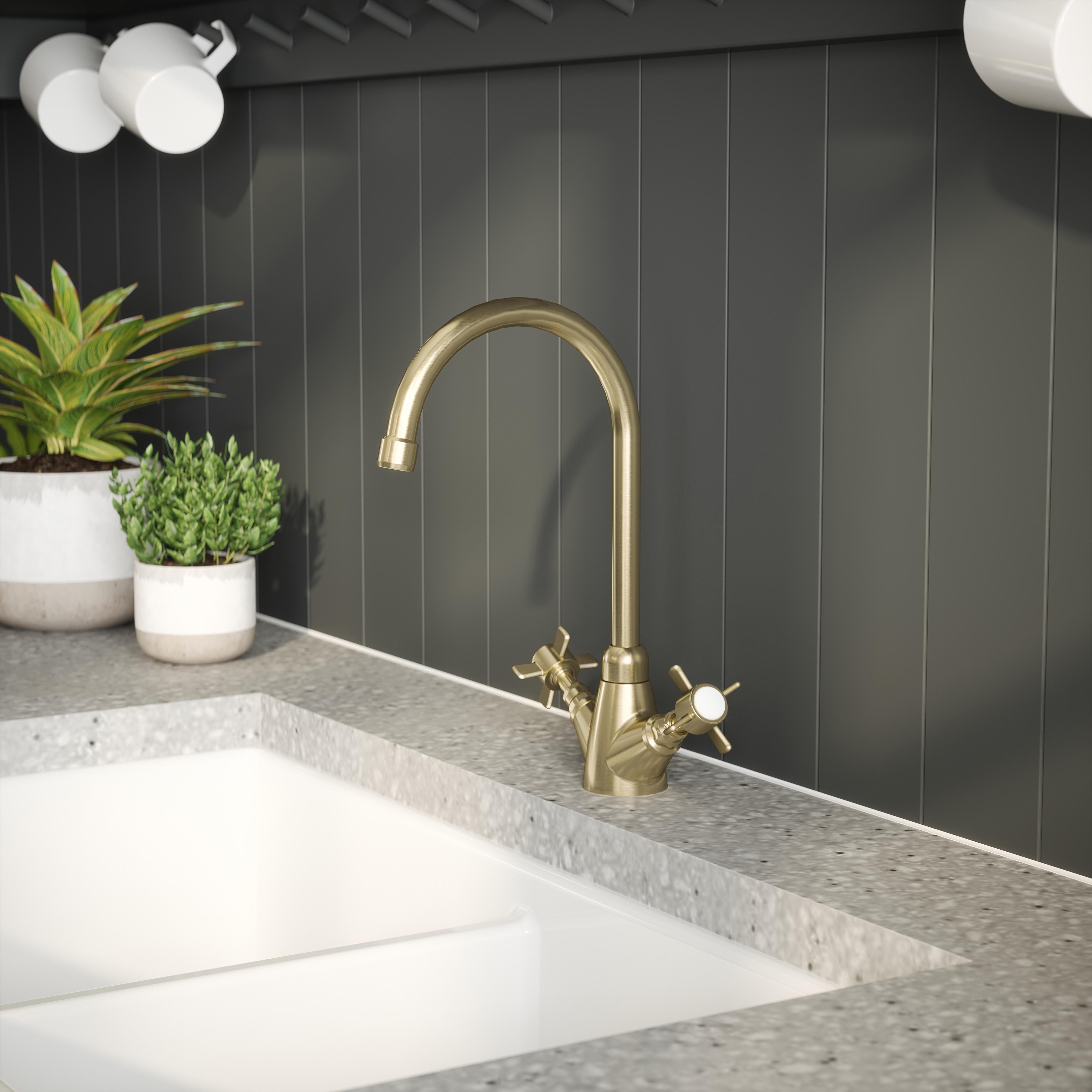 nuie Kitchen Taps Traditional Mono Crosshead Handle Sink Mixer Tap - Brushed Brass