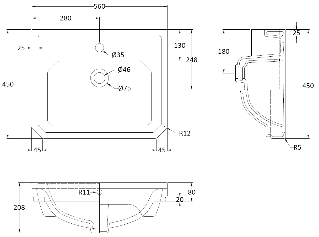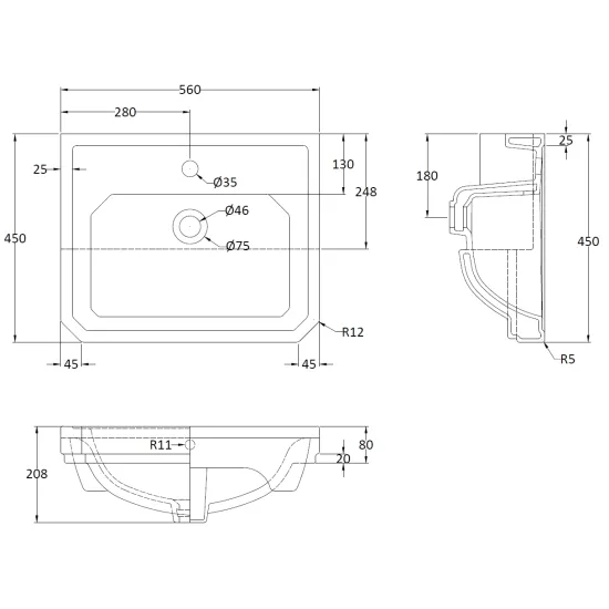 Carlton 560mm Semi Recessed Basin 1 Tap Hole