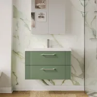 Nuie 800mm Satin Green Fluted Wall Hung 2-Drawer Vanity Unit with Basin With Chrome Handles