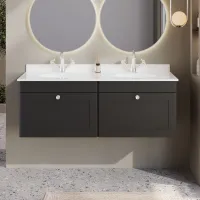 Nuie Classique 1220mm Soft Black Wall Hung 2 Drawer Vanity Unit With Round Basin, Backsplash & 2 Tap Holes