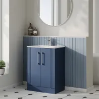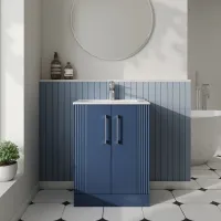 Nuie 600mm Satin Blue Fluted Floor Standing 2-Door Vanity Unit with Basin Including Chrome Handles