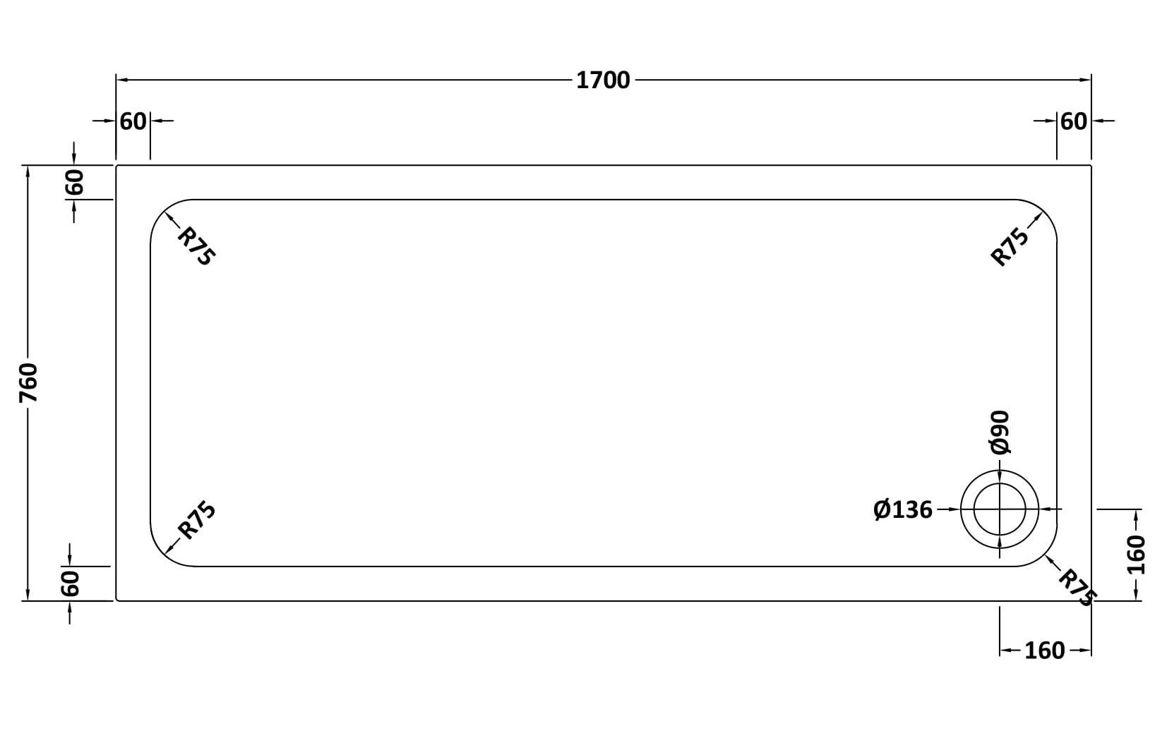 Hydro45 1700 x 760mm Anti Slip Rectangular Shower Tray