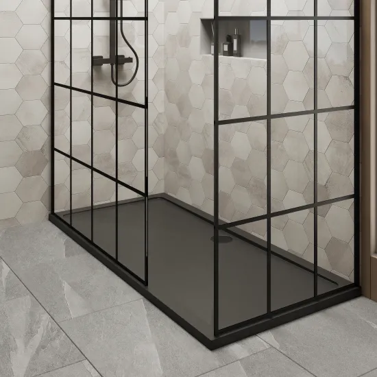 Nuie 1700mm x 700mm Matt Black Framed Walk-In Wetroom Screen Set & Slate Grey Tray