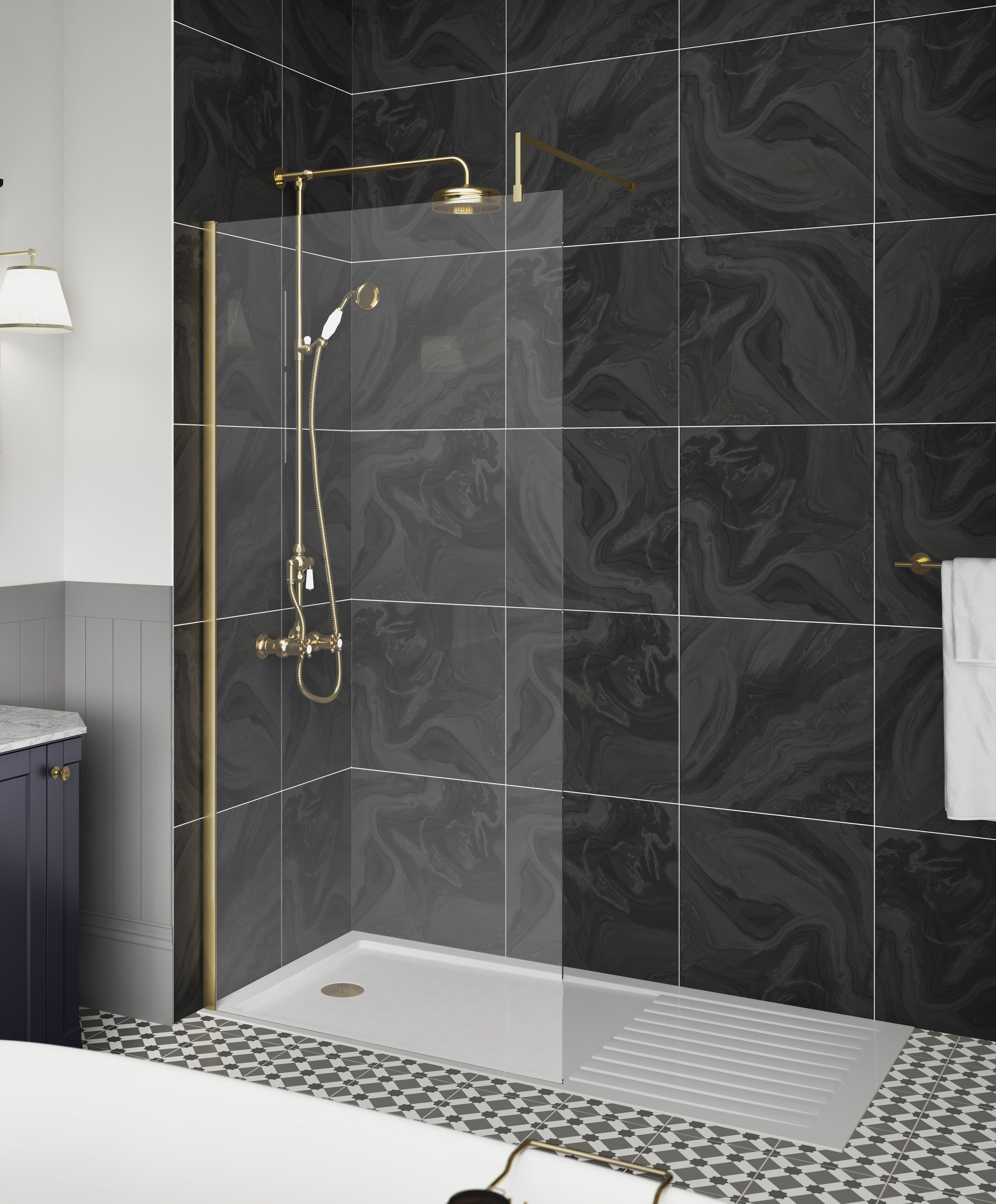 nuie 760mm Wetroom Screen With Support Bar - 8mm Glass - Brushed Brass