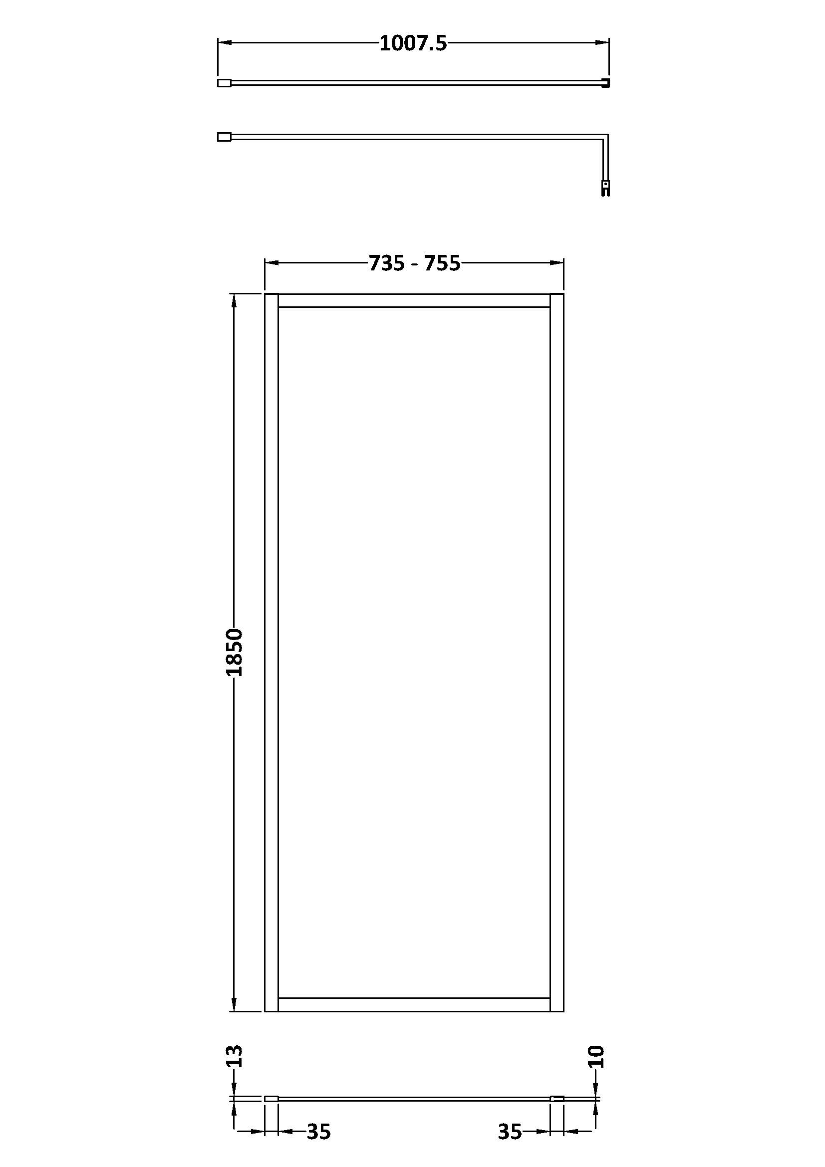 Nuie Matt Black 1850mm x 760mm Wetroom Screen Including Support Bar & Profile Kit