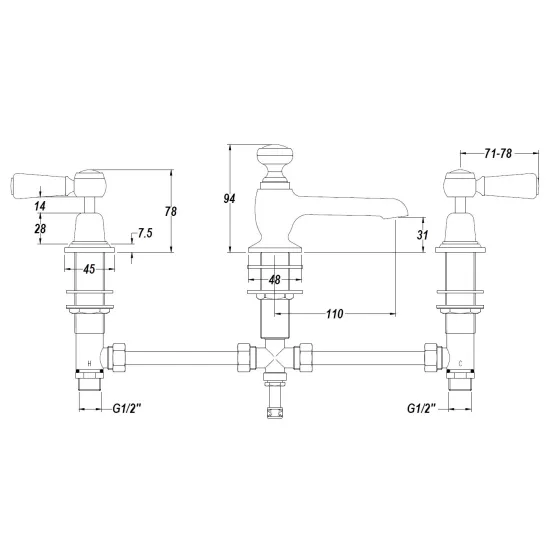 White Topaz With Lever Handle Wall Mounted Bath Spout & Stop Taps
