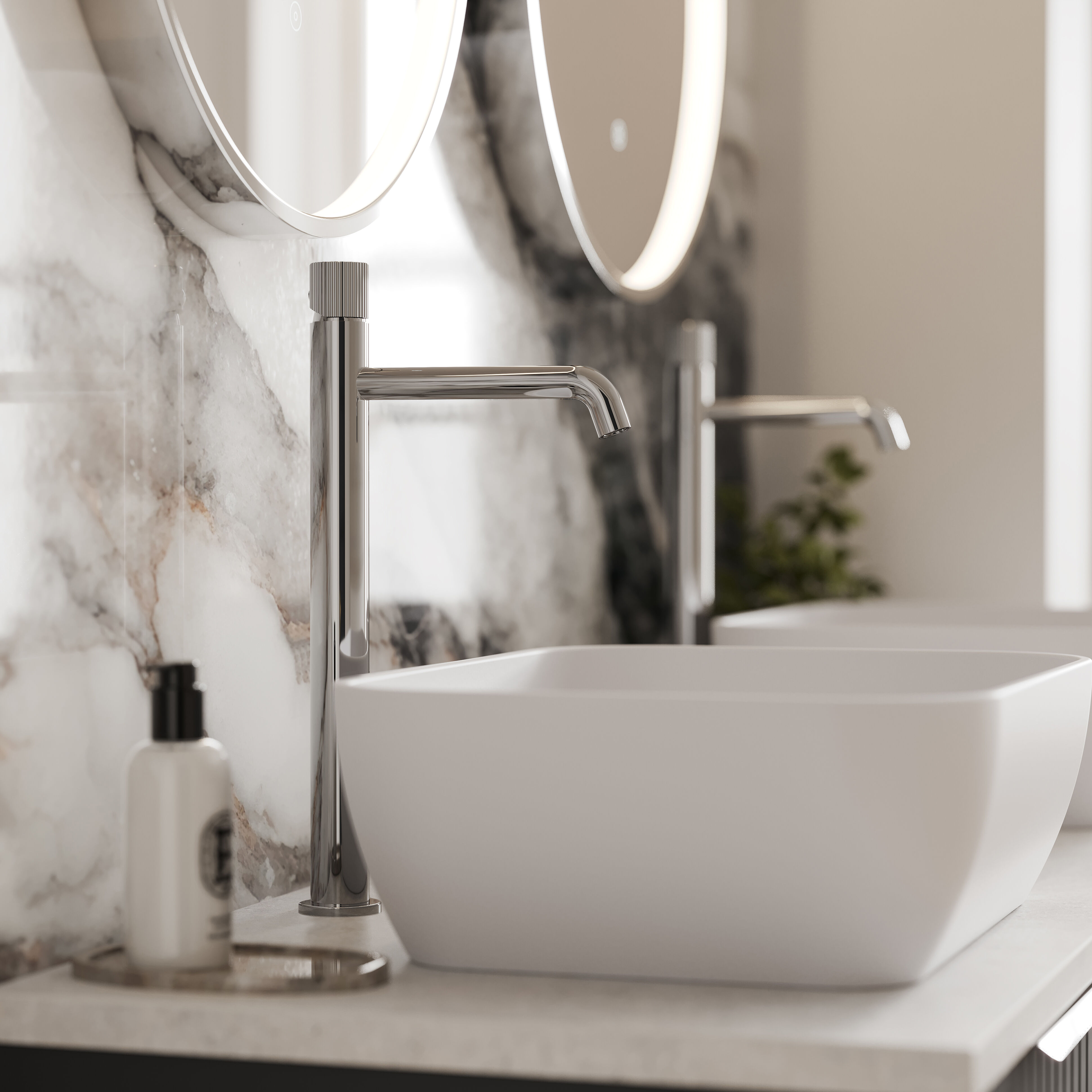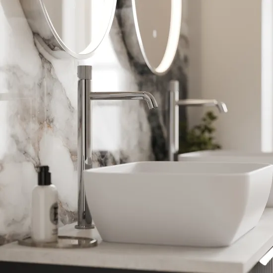 High-rise basin taps pair perfectly with countertop vessel basins, bringing a sleek, hotel-inspired feel to your bathroom.