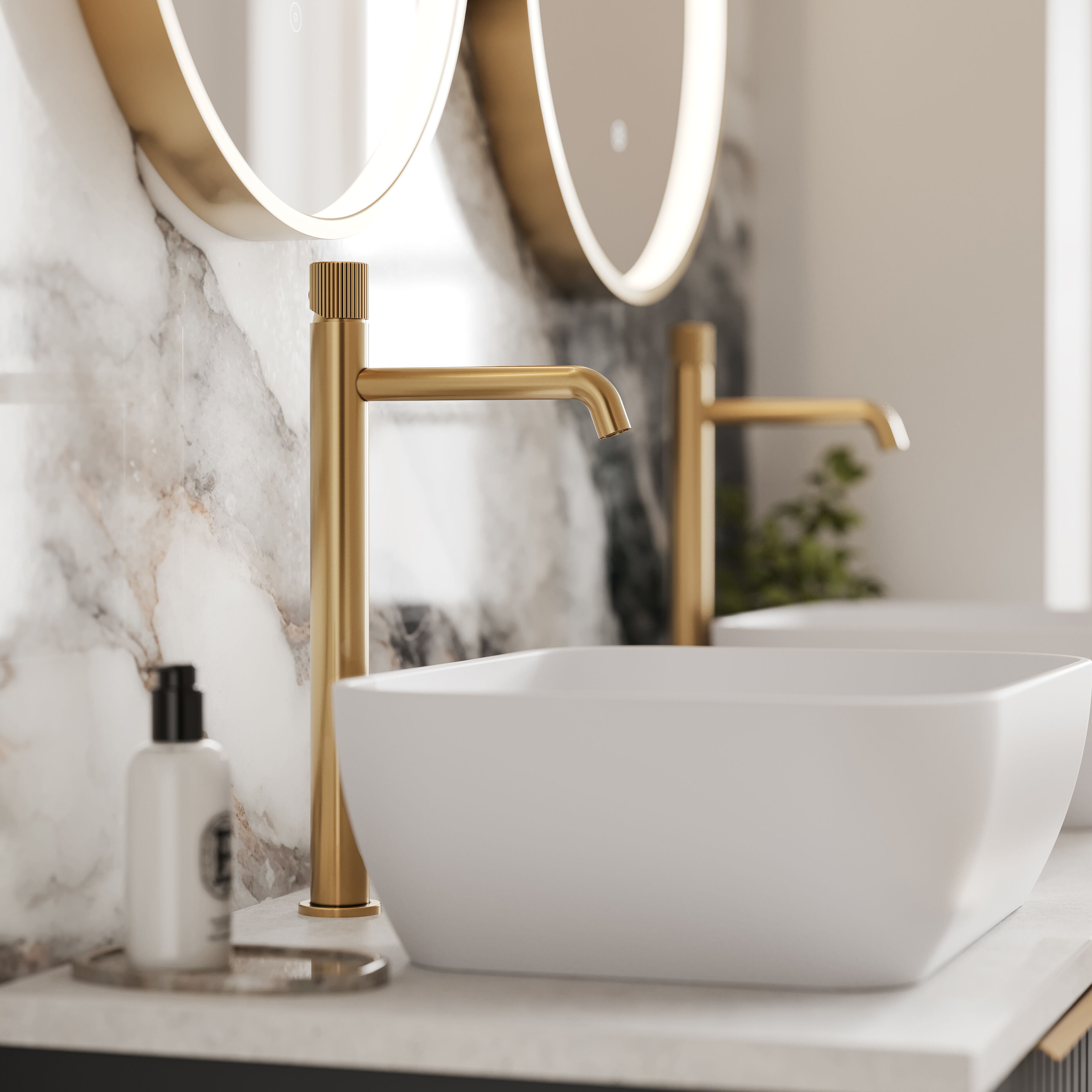 High-rise basin taps pair perfectly with countertop vessel basins, bringing a sleek, hotel-inspired feel to your bathroom.