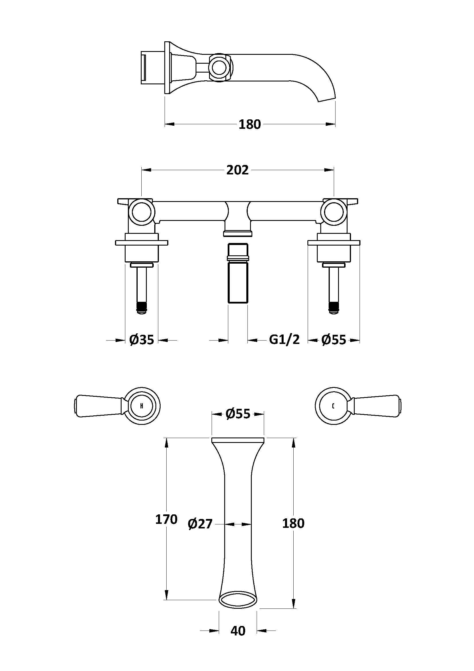 Bayswater 3-Hole Wall Mounted Basin Mixer With Spout Lever & Domed Collar