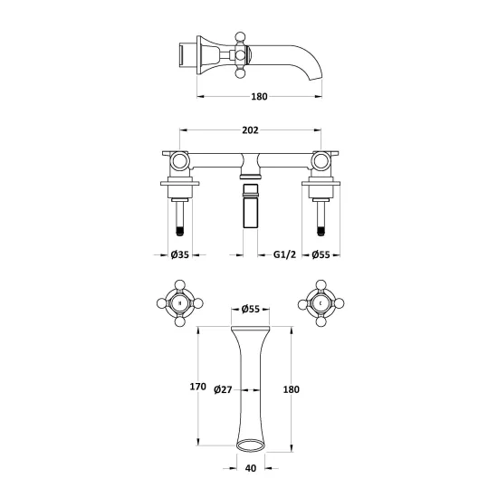 Black Topaz With Crosshead Handle 3 Tap Hole Wall Mounted Basin Mixer