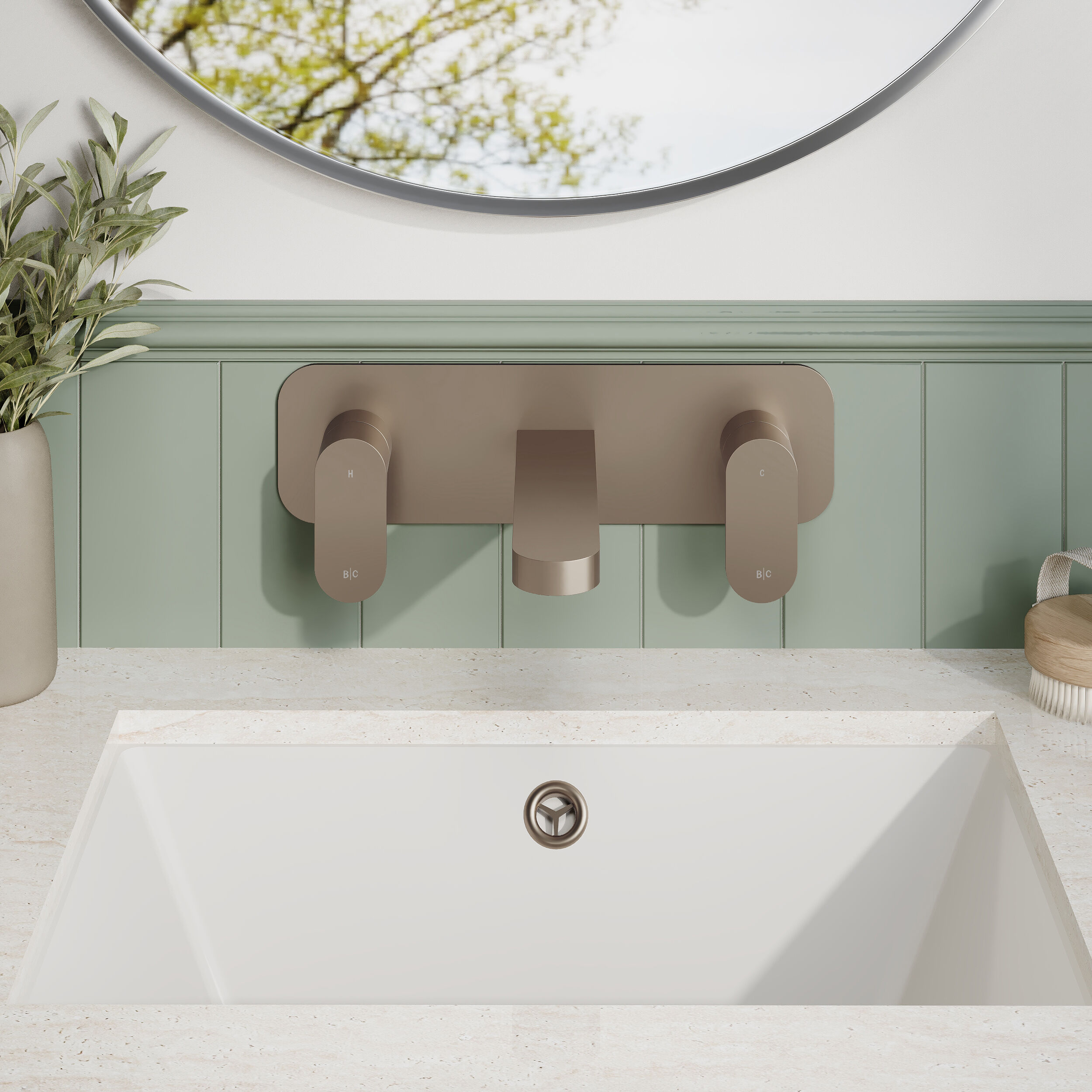 BC Designs Chelmsford Wall Mounted 3 Tap Hole Basin Mixer With Plate - Brushed Nickel