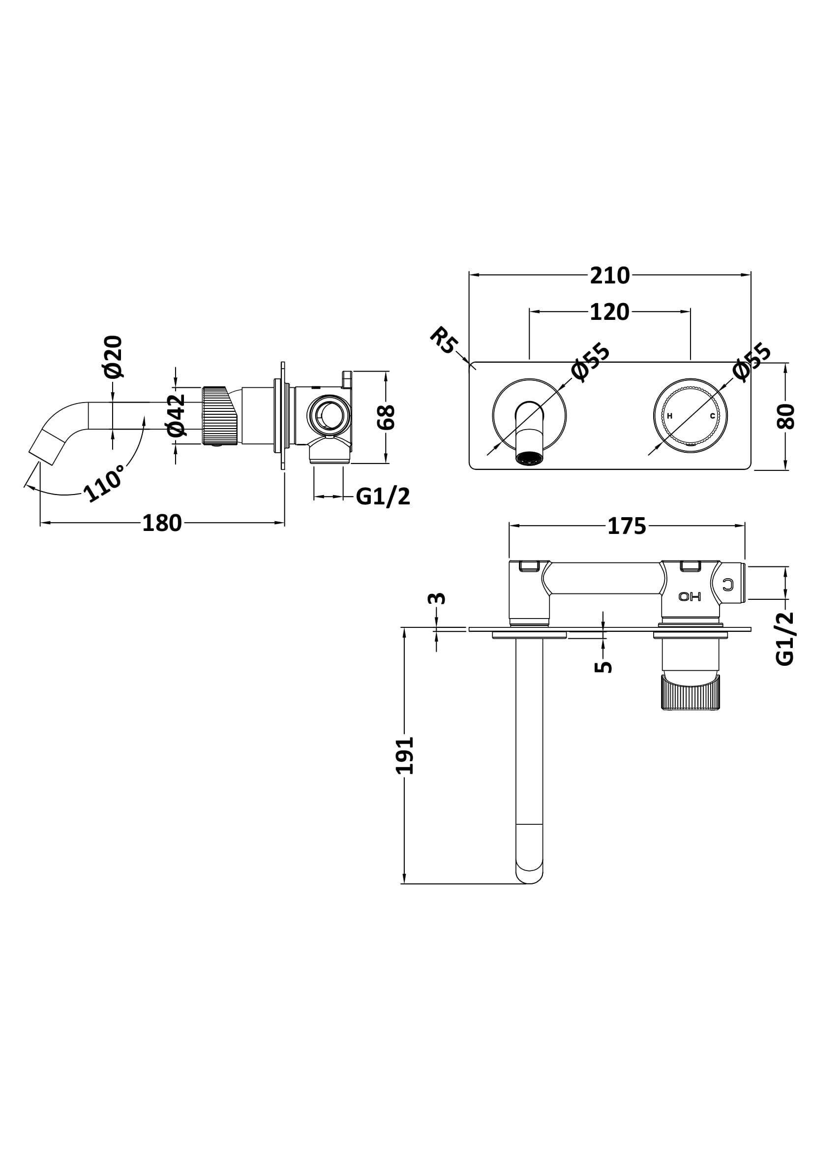 Windon Wall Mounted 2 Tap Hole Basin Mixer With Plate