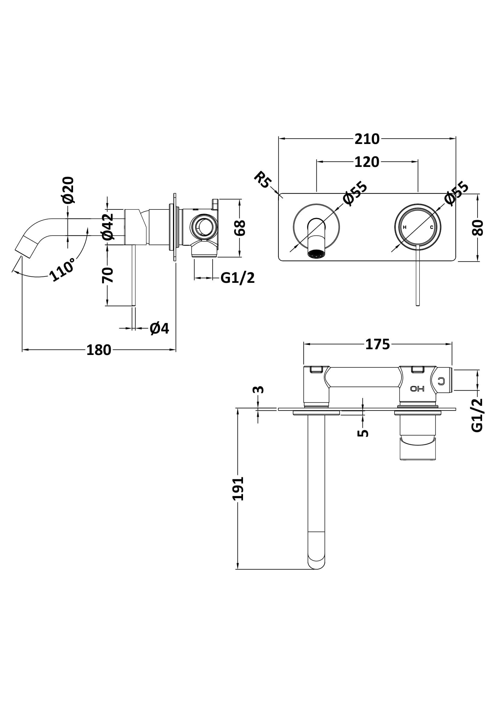 Windon Wall Mounted 2 Tap Hole Basin Mixer With Plate